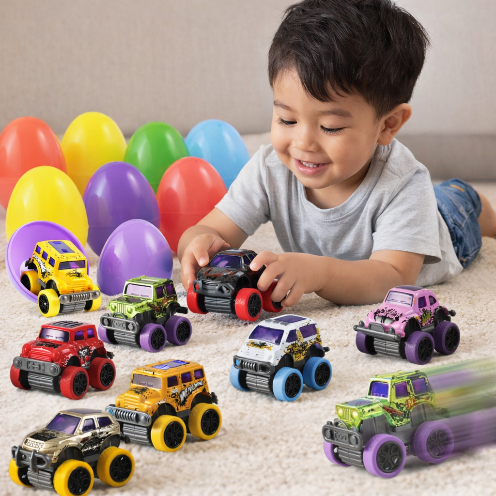 Unlike candy that disappears in minutes, Easter Eggs deliver lasting play. Each egg opens to reveal a pull-back monster car or truck, turning a simple egg hunt into hours of racing, laughter, and imagination.